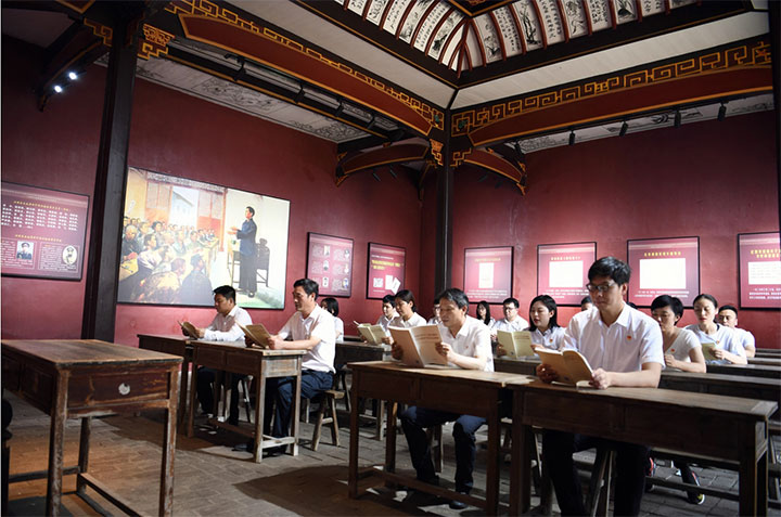 在興國縣蘇維埃政府所在地——瀲江書院,毛主席在這里舉辦了興國縣土地革命干部訓練班,為中央蘇區的土地革命培養了第一批斗爭骨干,建立了興國縣第一個革命政權。大家在土地革命干部訓練班舊址學堂內,集體誦讀了一段土地革命時期的歷史,當朗朗書聲再次在書院響起,珍貴的革命記憶浮于腦海,激勵黨員們延續紅色根脈、傳承紅色基因。
