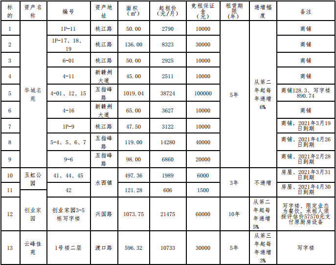 贛州振興實(shí)業(yè)有限責(zé)任公司委托江西江南拍賣有限公司,定于2021年5月28日14:30開始在贛州市公共資源交易中心(長征大道9號(hào))進(jìn)行國有資產(chǎn)公開招租,現(xiàn)歡迎符合條件的單位或個(gè)人前來報(bào)名參加競(jìng)租。