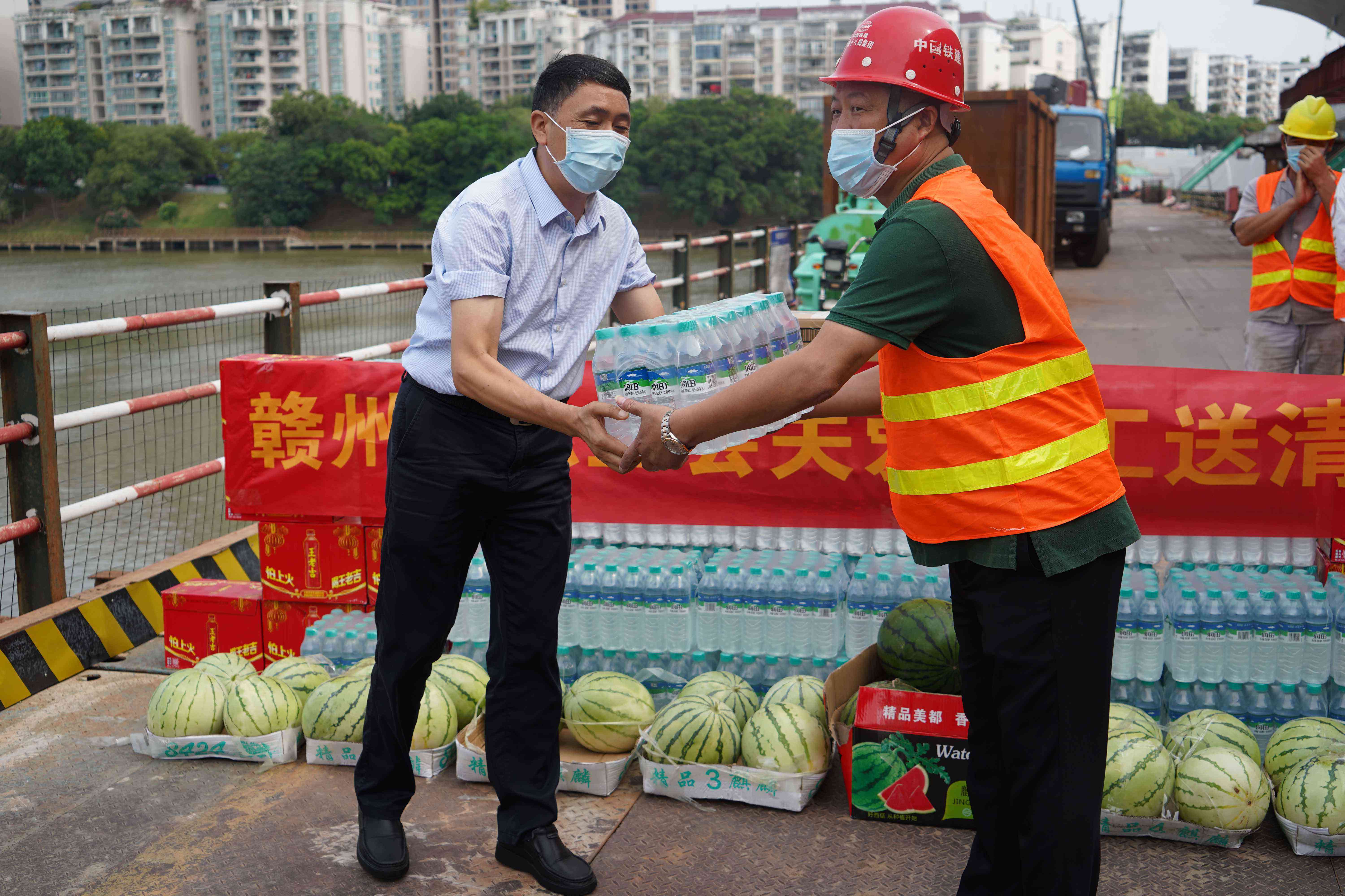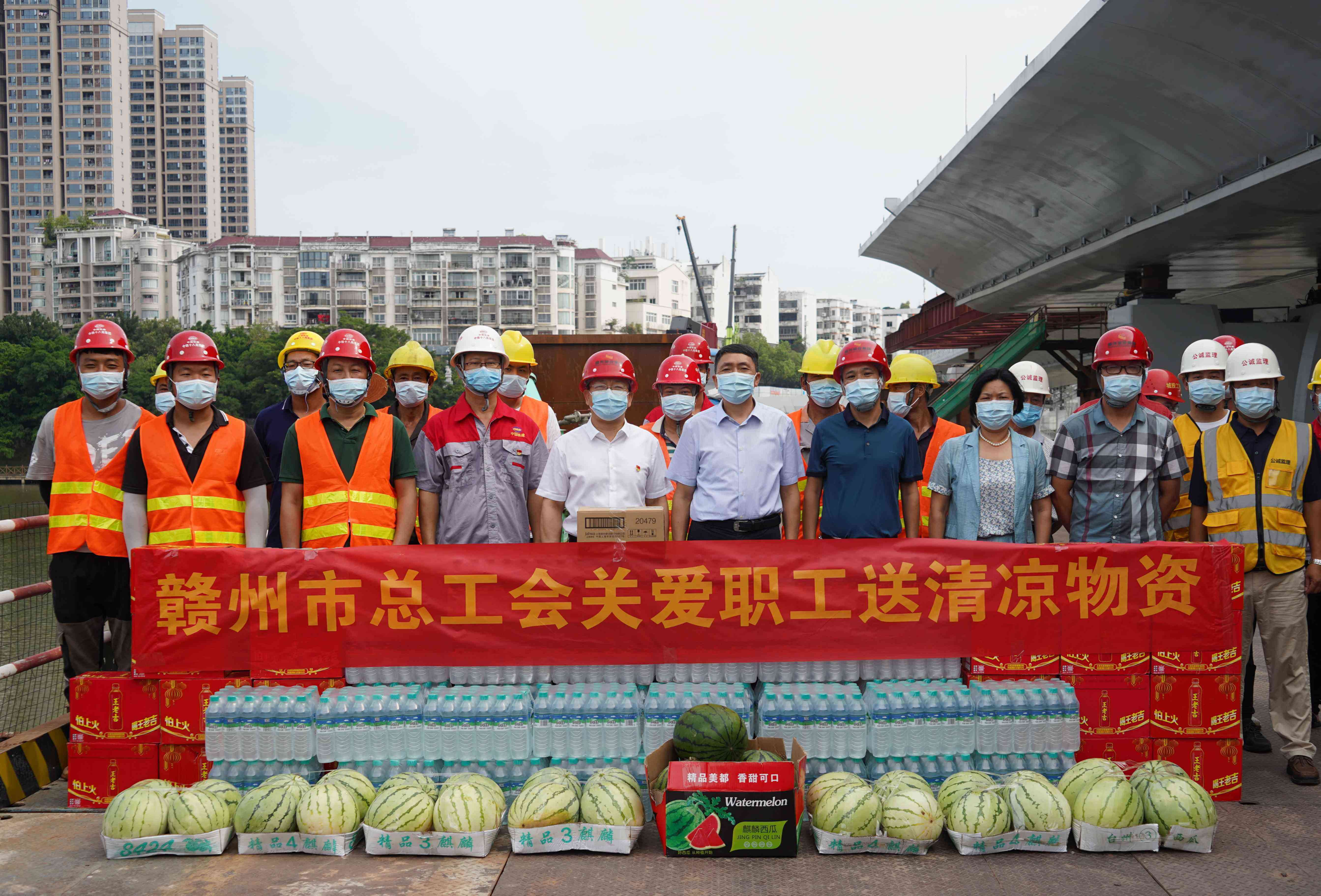 在慰問現場,賴定銘一行為南河大橋拓寬改造(二期)工程項目高溫下堅守崗位的一線職工發放了西瓜、礦泉水、王老吉等防暑降溫物品,并與項目一線職工交流談心,詢問了職工積極推進項目建設進展情況,聽取了贛州城投集團高溫津貼發放情況和落實高溫天氣作業勞動保護的有關措施,叮囑大家要科學安排高溫期間的施工任務,要堅持勞逸結合,特別要注意身心健康和施工安全,要認真做好項目工地疫情防控工作。