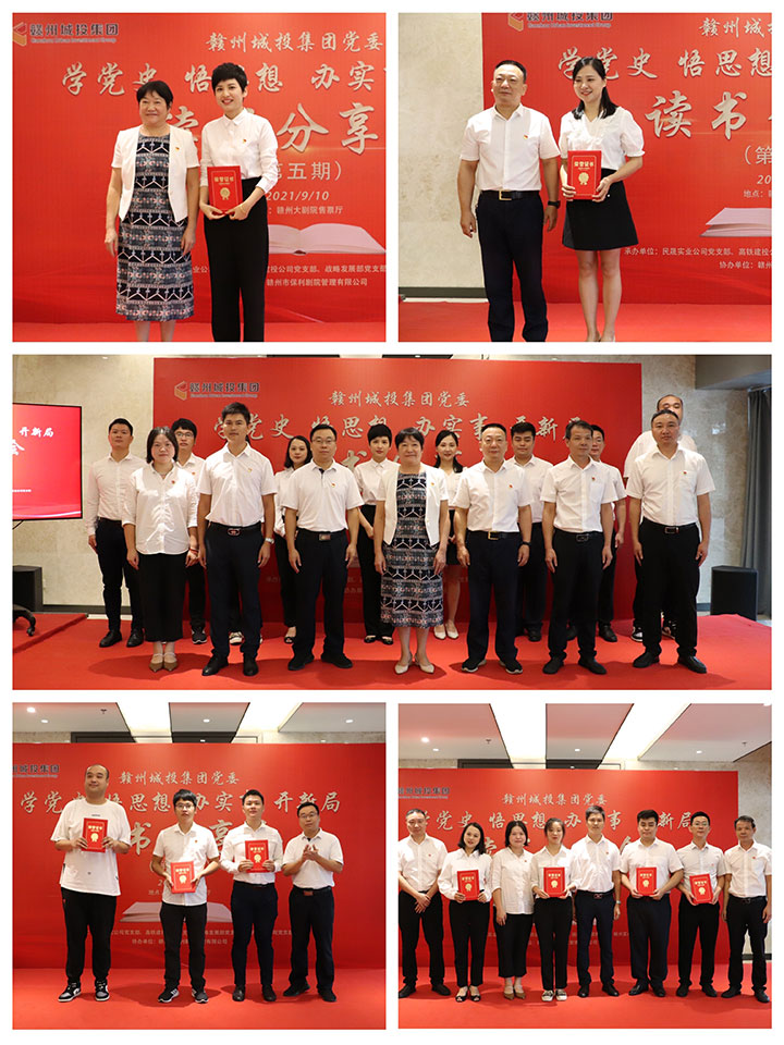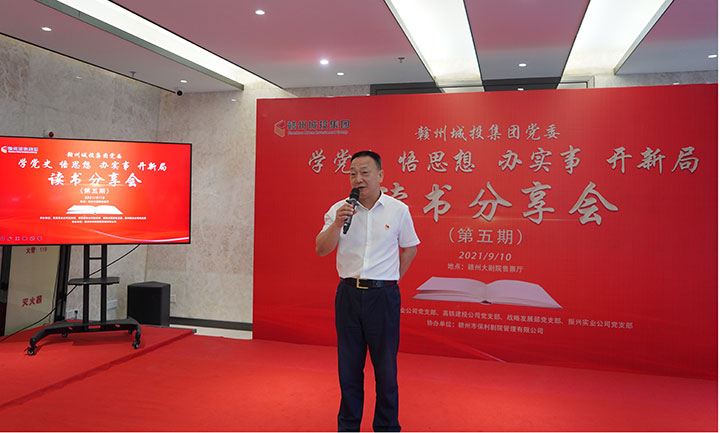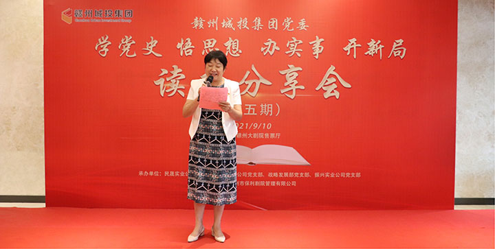 9月10日,為推動黨史學習教育有特色、出成效,贛州城投集團黨委在贛州大劇院售票廳舉辦“學黨史 悟思想 辦實事 開新局”黨史學習教育第五期讀書分享會。市國資委二級調研員宋英蒞臨指導,集團黨委副書記黃家偉出席并作點評講話,集團董事會秘書、集團相關部門負責人、各黨支部書記及部分黨員參加。