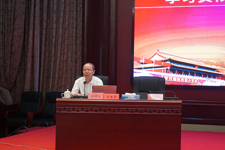 莊春賢以“牢記初心擔使命,砥礪奮進新征程”為題,從“深刻領會習近平總書記”七一“重要講話的重大意義,切實把學習貫徹講話精神作為一項重大政治任務抓緊抓好;全面把握習近平總書記”七一“重要講話的豐富內涵,深入理解講話提出的一系列新思想新觀點新論斷;準確把握習近平總書記”七一“重要講話的實踐要求,縱深推進新時代贛南蘇區振興發展“三個方面”,通過引用偉大的革命先驅為中華民族的偉大復興而奔走奮斗的英雄事跡,深刻闡釋了偉大建黨精神譜系和以史為鑒、開創未來”九個必須“的根本要求,對習近平總書記”七一“重要講話進行了系統闡述和重點解讀。